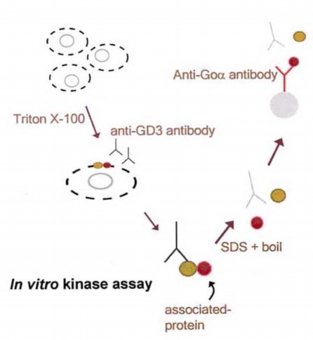 スフィンゴ糖脂質が機能を発現する方法として、何等かのタンパク質と会合しその機能を調節している可能性が考えられた。そこで抗スフィンゴ糖脂質抗体で免疫沈降することにより、想定される「スフィンゴ糖脂質会合タンパク質」が共沈し、単離同定が可能になるのではないかと考えた(図1)。そして小脳顆粒神経細胞を使って抗ガングリオシドGD3抗体で免疫沈降し、γ32P-ATPを加えin vitro kinase assayをおこなったところ、40, 53, 56, 80kDaタンパク質のリン酸化が検出された。40kDaタンパク質は三量体Gタンパク質Goのαサブユニット(Goα)、53/56kDaタンパク質はsrcファミリーチロシンキナーゼLyn、80kDaタンパク質がCbp (Csk-binding protein)であることが、それぞれ特異的抗体を用いた再免疫沈降実験からわかった。さらに小脳顆粒神経細胞の表面タンパク質をヨード125で標識したところ、抗ガングリオシドGD3抗体で共沈する135kDaタンパク質がGPIアンカー神経細胞接着分子TAG-1であることもわかった。