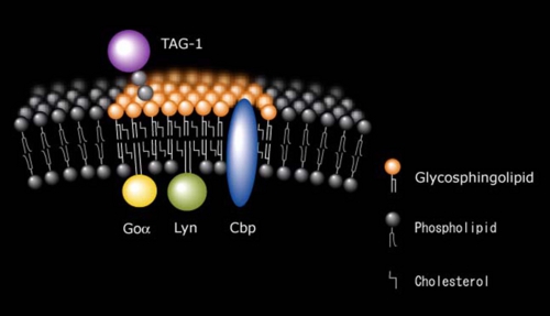TAG-1は神経突起伸長活性を持つ免疫グロブリンスーパーファミリーに属するGPIアンカー神経細胞接着分子で、発生初期の小脳顆粒神経細胞に強く発現している。膜貫通領域を持たないTAG-1が細胞内にシグナルを伝えるメカニズムは不明であったが、小脳顆粒神経細胞表面のTAG-1を抗体でクロスリンクするとLynが活性化したことから、TAG-1がLynにシグナルを伝達していることがわかった[Kasahara et al. J.Biol.Chem. 275 34701-34709 (2000)](図5)。さらにTAG-1、Lyn、CbpおよびガングリオシドGD3はすべて成長円錐画分に濃縮していたことから、TAG-1によるシグナル伝達は小脳顆粒神経細胞の成長円錐ラフトでおこっていることがわかった。最近TAG-1欠損マウスが小脳顆粒神経細胞の内顆粒層への移動に異常をきたすことが報告された。これらのことから、小脳顆粒神経細胞の発生初期における細胞移動に、TAG-1/Lyn/CbpのガングリオシドGD3ラフトにおけるシグナル伝達が関わっているものと考えられた。