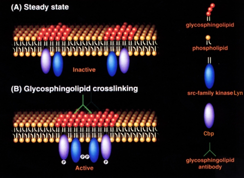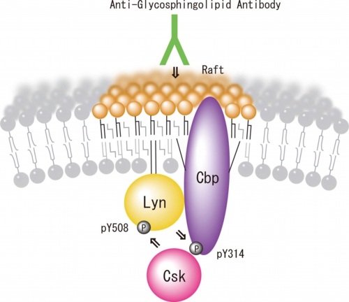 小脳顆粒神経細胞表面のガングリオシドGD3に抗GD3抗体が結合するとLyn活性化、Cbpの314チロシン残基リン酸化がおこるメカニズムについては、図4に示すモデルを考えている。未刺激時にはLyn分子は活性の低い状態で離れて存在しているが、抗GD3抗体が結合すると脂質ラフトが融合する。するとLyn分子どうしが接近し互いに416番目のチロシン残基をリン酸化(Transphosphorylation)することにより活性の高い状態になる。そして脂質ラフトに存在する基質タンパク質Cbpがリン酸化される。