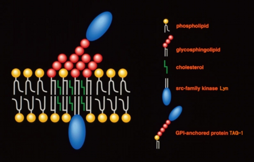 Tリンパ球が抗原刺激により活性化する際に、脂質ラフトを介するシグナル伝達が必要であることがわかっている。抗原が抗原受容体に結合するとそこにガングリオシド(シアル酸を持つスフィンゴ糖脂質)GM1からなる脂質ラフトが集合し、その領域の細胞質側でSrcファミリーチロシンキナーゼをはじめいくつかのシグナル伝達分子が集合体をつくることにより、細胞の活性化に必要な効率の高いシグナル伝達を可能にしている。免疫系のみならず多くの細胞系において、接着移動や分化増殖といった現象に関与している。脂質ラフトは安定な構造体ではなく、刺激に応じて集合状態を変化させる。刺激を受けていない定常状態における脂質ラフトは1-20nmの大きさで1ミリ秒程度の寿命であるが、刺激を受けることにより大きく安定なラフトができる。また脂質ラフトは均一ではなく、分子組成の異なる脂質ラフトが存在し、それぞれ特異的な機能を果たしていると考えられている。Tリンパ球は遊走時、先導端の膜にはガングリオシドGM1特異的なラフトが局在し、細胞後方の尾部の膜にはガングリオシドGM3特異的なラフトが局在する。そして、それぞれに遊走に関わる異なる機能タンパク質が共局在している。