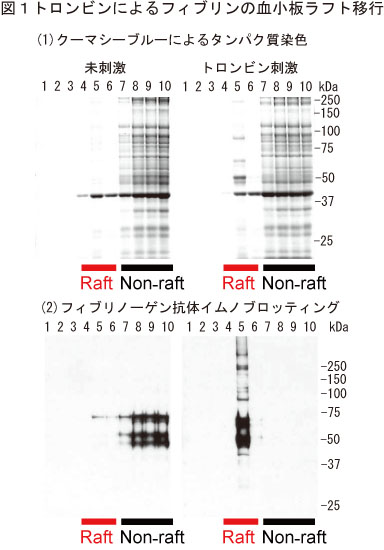 ヒト洗浄血小板をトロンビンで活性化後、ショ糖密度勾配遠心にてラフト画分(フラクション4-6)、非ラフト分画(フラクション7-10)を調製した。ラフト分画に存在するタンパク質を電気泳動にて分離後、質量分析装置によって同定した。トランスグルタミナーゼである活性化XIII因子によるフィブリンγ鎖の架橋部位のグルタミンをアラニンに置換したヒト成長ホルモンとの融合タンパク質を作製し、脂質ラフトへの移行を調べた。血餅退縮は、platelet-rich plasmaにトロンビンを添加し形成されたclotが経時的に収縮する様子をデジタルカメラで撮影し、面積比を計測した。