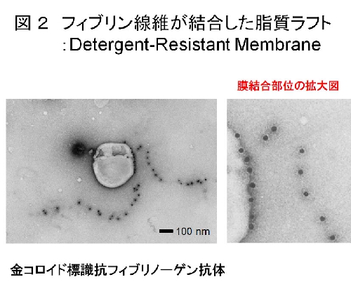 ヒト洗浄血小板をトロンビン刺激すると分子量67,52,47kDaの主要タンパク質が脂質ラフト画分(ショ糖密度勾配遠心)に検出された(図1)。質量分析によりその同定を試みたところ、それぞれフィブリンのα,β,γ鎖であることがわかった。そしてフィブリノーゲン/フィブリン抗体を使ったイムノブロッティング法によって、未刺激時にはフィブリノーゲンとして非ラフト画分に存在し、30秒間のトロンビン刺激によってフィブリンになりラフト画分に移行することを確かめた。またトロンビン刺激血小板においてフィブリンが、ライセニン陽性のスフィンゴミエリンラフトと共局在した。さらに実際にフィブリンがトロンビン刺激血小板の脂質ラフトに結合しているかどうかを免疫電顕法により解析したところ、脂質ラフト画分の膜にフィブリン線維が直接結合していることが観察された(図2)。