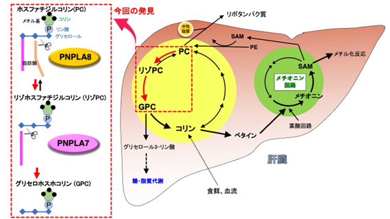 肝臓では細胞膜の主要構成成分であるホスファチジルコリン(PC)にコリンが大量に貯蔵されているが、PCを分解してコリンを取り出す酵素群はこれまで見つかっていなかった。本研究により、PCに2つ結合する脂肪酸のうちの1つがホスホリパーゼA2[10]活性を持つPNPLA8によって切り取られてリゾPCとなり、さらにもう一つの脂肪酸がリゾホスホリパーゼ[11]活性を持つPNPLA7によって切り取られてグリセロホスホコリン(GPC)となることが、それぞれの酵素を欠損するマウスの解析により明らかとなった。GPCはコリンとグリセロール3-リン酸[12]に分解され、コリンはさらにベタインに変換されてメチオニン回路にメチル基を供給するのに役立つ。