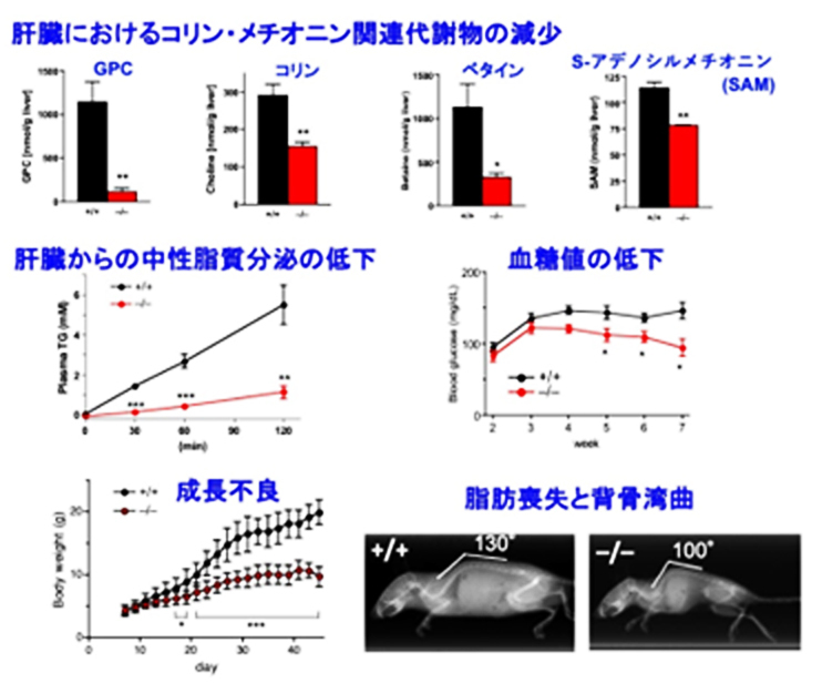 (上段)PNPLA7をコードする遺伝子を欠損したマウス(–/–.赤)は、6週齢の肝臓に含まれるグリセロホスホコリン(GPC)、コリン、ベタイン、S-アデノシルメチオニン(SAM)などのコリン・メチオニン関連代謝物の量が、野生型(+/+.黒)と比べて減少していた。