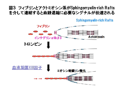 トロンビン刺激によりフィブリノーゲンがα顆粒から放出されインテグリンαIIbβ3 に結合しフィブリンに変換され、活性化血液凝固第XIII因子によってスフィンゴミエリンラフトが集積し、細胞内のアクトミオシン系と連結することにより血餅退縮に必要なシグナル伝達がおこると考えられた[Kasahara et al. Blood 122, 3340-3348 (2013)](図3)。スフィンゴミエリンを標的とした新しい血栓症治療法の開発につながることが期待される。本研究はINSIDE BLOOD欄で紹介されました[Munday et al. Blood 122, 3246-3247 (2013)]。詳しくはこちら