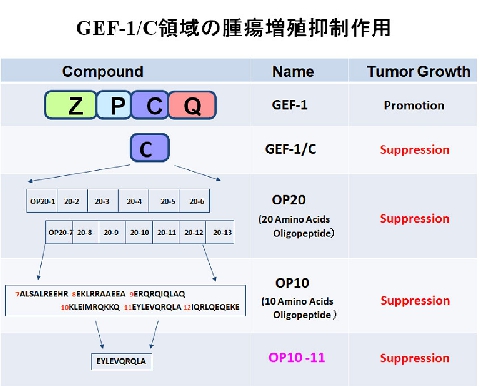 GEF-1(HGS)を分子標的とした新規増殖抑制法の基礎研究を進めている。GEF-1の発現抑制法(shRNA法、および、siRNA法)やGEF-1のC領域蛋白(GEF-1/C)発現により、マウス及びヒト由来のがん腫瘍の増殖を抑制できることを明らかにした。さらに、腫瘍抑制剤の開発を目的としたGEF-1/C構成オリゴペプチドによるがん腫瘍増殖抑制効果を検証した。GEF-1/Cを構成する数種類のオリゴペプチドは、in vitro系・in vivo系において、マウスB16細胞、ヒト難治性肺がん細胞A549細胞、膵がん細胞PT45細胞、大腸がん細胞COLO205細胞の腫瘍増殖を抑制した(図)。