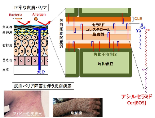 皮膚の最外層である角層は、外界からの異物侵入や肌水分の喪失を防ぐバリア機能を備えており、これらの機能が障害されると魚鱗癬、ドライスキン、アトピー性皮膚炎などの要因となります。角層のバリア機能には脂質代謝が重要であり、中でも表皮特有に存在するアシルセラミド(ω-O-acylceramide、Cer[EOS]とも呼ばれる)の代謝は水分透過性バリアの形成において中心的な役割を果たします。なぜなら、アシルセラミドは角質細胞間脂質のラメラ構造の形成・維持に不可欠な脂質成分であるとともに、リノール酸部分が複雑な過程で酸化された後に角化不溶性膜(周辺帯)と共有結合し、CLE(corneocyte lipid envelope)と呼ばれる非常に重要な1層の脂質層を形成する際の原料として利用されるからです(図)。アシルセラミドの化学構造は、スフィンゴシン骨格(図の右端のアシルセラミドの化学構造式の青色部分)に酸アミド結合する脂肪酸の鎖長が炭素数30〜38程度と極端に長いこと(構造式の赤色部分)、さらにその先端(ω末端と呼ぶ)にリノール酸(炭素数18、不飽和結合数2のω-6必須脂肪酸)がエステル結合している(構造式の紫色部分)という特徴があります。このような極めて特殊な化学構造にはどのような意味があるのでしょうか?