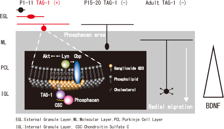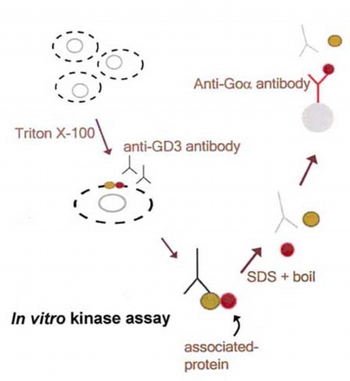 Glycosphingolipids are known to exist in clusters and form microdomains containing cholesterol at the surface of the plasma membrane called lipid rafts. The glycosphingolipid microdomains have been implicated in signal transduction because a variety of signaling molecules, such as the Src family kinase, are associated with them. We found that anti-ganglioside GD3 antibody coprecipitates Lyn, Cbp, Goα and TAG-1. Sucrose density gradient analysis showed that the ganglioside GD3-binding ptoteins were detected in raft fraction, suggesting that immunoprecipitation with anti-glycosphingolipid antibody is an immunoisolation method for lipid rafts (Kasahara et al. Glycoconjugate J. 17 152-162, 2000) Link. Fig. 2 shows a hypothetical model of association of ganglioside GD3-binding proteins with lipid rafts of cerebellar granule cells.