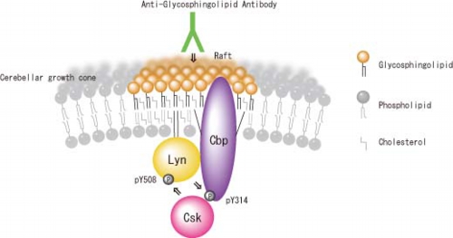Fig. 4 shows activation model of Lyn and tyrosine phosphorylation of Cbp by glycosphingolipid crosslinking. It is assumed that glycosphingolipid crosslinking leads to coalescence of lipid rafts. This may induce clustering of Src family kinase and transphosphorylation of tyrosine residue at activation site.