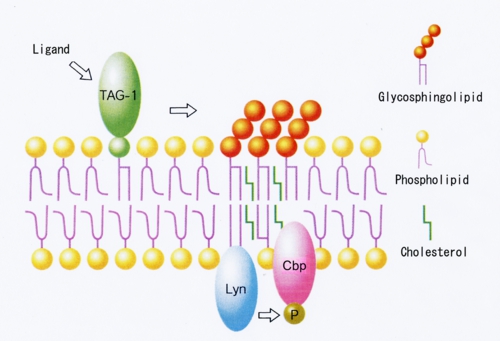 We attempted to identify the cell-surface molecules involved in Lyn signaling, because Lyn is a nonreceptor-type kinase. We found that R24 co-immunoprecipitates TAG-1 and that the antibody-mediated crosslinking of TAG-1 induces Lyn activation (Fig. 5). Furthermore, enzymatic degradation of cell-surface ganglioside reduces TAG-mediated Lyn activation, suggesting that gangliosides are involved in TAG-1-mediated signaling in lipid rafts.