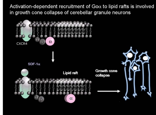 Using sucrose gradient assay with cerebellar membranes, Goα, but not Gβγ, was observed in detergent-resistant membrane (DRM) raft fractions, after the addition of GTPγS which stabilizes Go the active form. On the other hands, both Goα and Gβγ were excluded from DRM fractions in the presence of GDPβS which stabilizes Go in its inactive state. Furthermore, Goα was concentrated in neuronal growth cones. The treatment with stromal derived factor (SDF)-1α, a physiological ligand for G protein-coupled receptor, stimulated [35S] GTPγS binding to Goα, and caused Goα translocation to DRM fractions, leading to growth cone collapse of cerebellar granule neurons. After GTPγS treatment, Goα is co-immunoprecipitated with monoclonal antibody to GAP-43, a growth cone-enriched and raft marker protein. These results demonstrate the involvement of signal-dependent Goα translocation to rafts in the growth cone behavior of cerebellar granule neurons (Fig. 6).