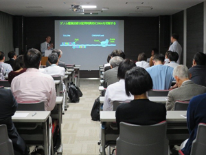 都医学研からは、今年1月に着任した宮岡佑一郎 再生医療プロジェクトリーダーが「ゲノム編集による肝疾患治療の可能性」とのテーマで、疾患の原因遺伝子の正確かつ効率的なゲノム編集技術を駆使した、ヒトiPS細胞及び肝臓など生体組織での遺伝子修復等、臨床への応用を目指す研究の内容を紹介しました。