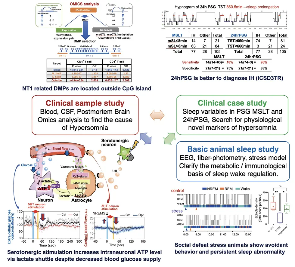 We continue to recruit clinical cases suspected of hypersomnia (total >1000) with PSG-MSLT data and DNA sample. By omics analysis we identified fatty acid/metabolic abnormalities in NT1 and IH and global hypomethylation in NT1