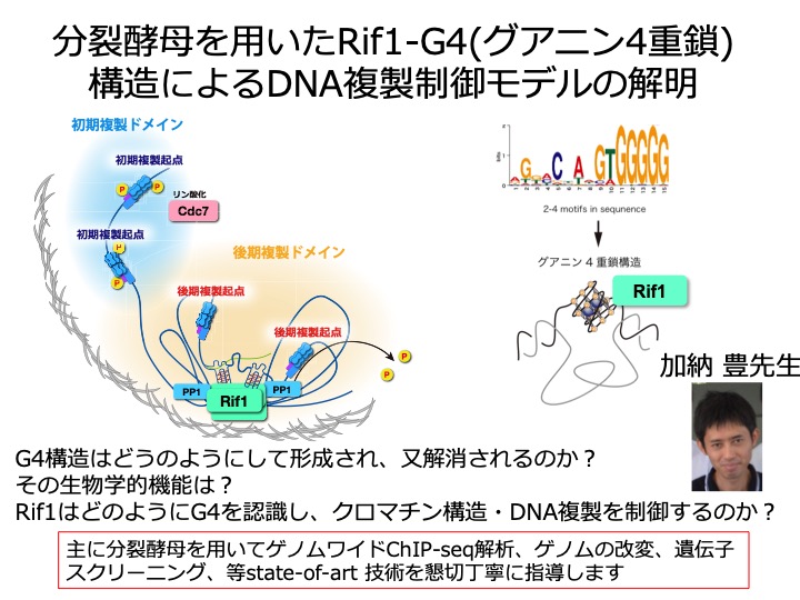 ゲノム複製の研究から、ゲノムの新原理の解明に挑むチャレンジングな研究に参画したい大学院生を募集する。