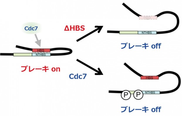 Mrc1は、通常、複製開始を抑制するブレーキonの形態を取っている(複製開始にhsk1機能を必要とする)。この時、Mrc1分子上のHBS(Hsk1 binding sequence)はN端近傍のNTHBSと分子内相互作用している。Cdc7キナーゼ(分裂酵母ではHsk1キナーゼと呼ばれる)はHBSを介してMrc1に結合し、NTHBSの近傍をリン酸化する。その結果、HBS-NTHBS間の相互作用が解除される。その結果、Mrc1のconformationが変化し、ブレーキoffの形態になる(右下;複製開始)。∆HBSはHBSの欠損のために、恒常的にブレーキoffのconformationをとるために、hsk1なしでも複製開始できるようになる(hsk1変異のバイパス)。