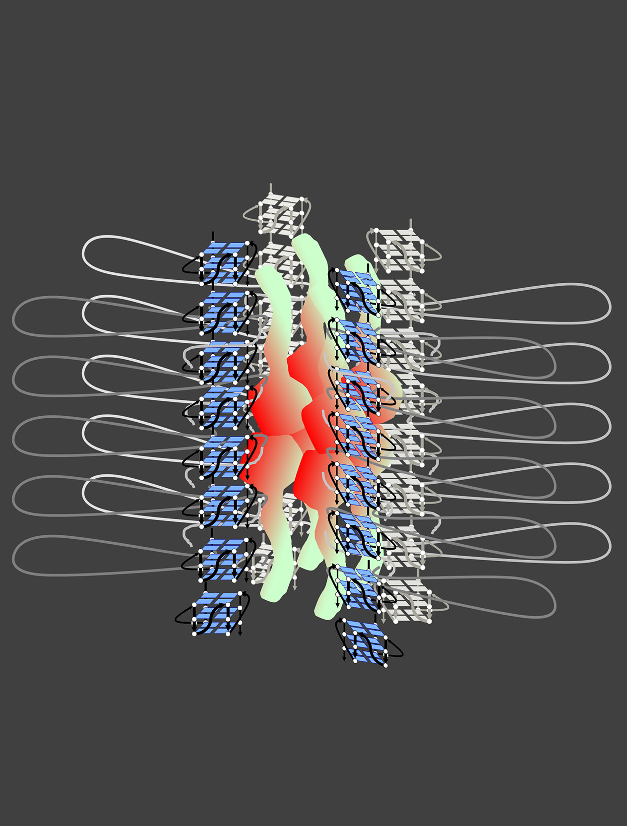 Rif1はC端G4結合ドメイン(赤)とN端HEATリピート構造(黄緑)から形成される。C端は8~16量体を形成するとともにG4構造に結合する。HEAT リピートも会合するとともに、G4構造と相互作用する。Rif1は、同時に複数のG4構造と相互作用できる。また電子顕微鏡での観察などに基づき、Rif1はN端とC端の両ドメインを介してゲノム上に散在するG4構造に結合し、これらを束ね、クロマチンループを形成する。Rif1は核膜と相互作用し、核膜近傍に局在しており、核膜の近傍でこのような構造を作ると考えられる。この構造は、TADやLADとも関連するとともに、複製開始に抑制的なクロマチンドメイン(中期~後期複製タイミングドメイン)を形成すると想像している。