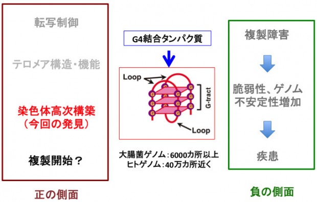 図4 グアニン4重鎖構造の生物学的意義:今回、染色体の高次構造の形成制御 という普遍的な機能の一端が明らかになった。