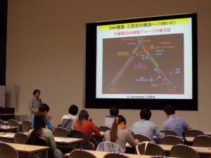 2014年5月21日、東京大学教養学部全学自由研究ゼミナール「生命科学の現在・パート16」において、正井リーダーが講義「私の研究歴:太平洋を初めて渡って33年ーDNA複製の原理を探求して」(医学研講堂)。 松田良一先生の引率で、11人の東大教養学部の学生さんが来所されました。