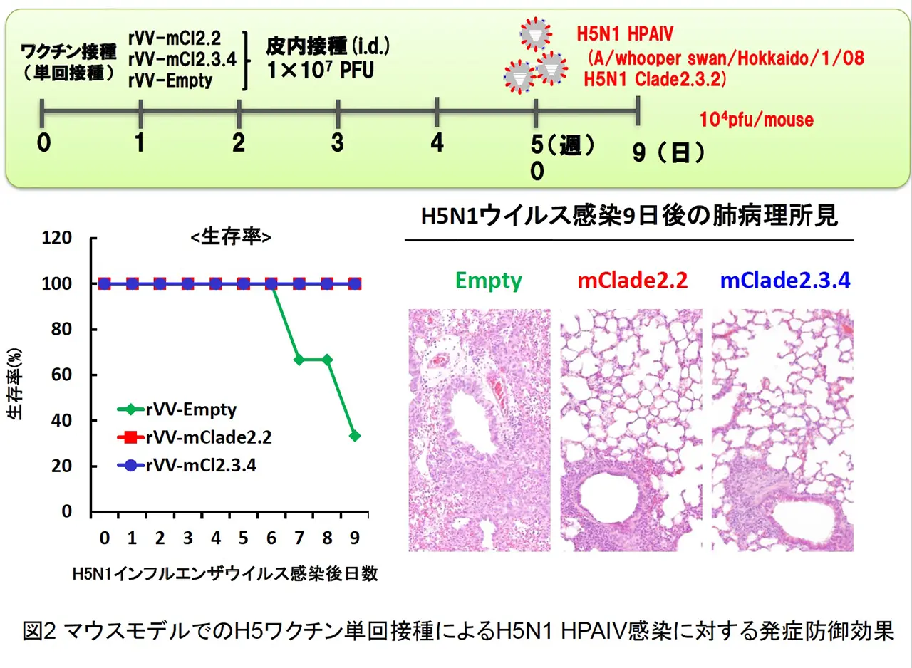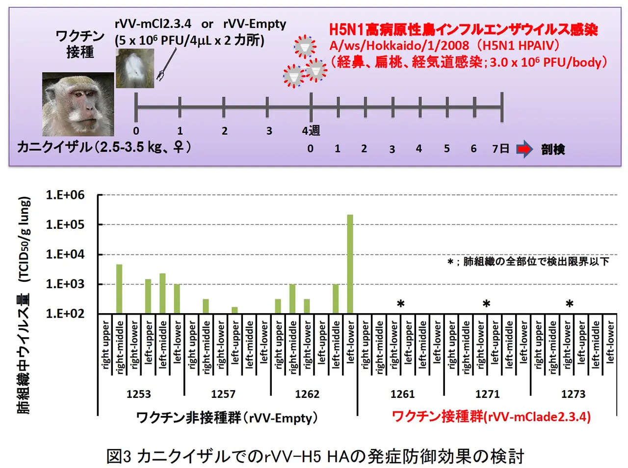 BALB/c マウスの皮内に rVV-H5 HA を単回接種し、その後 H5N1 HPAIV による致死性攻撃感染を行いました(図2)。ワクチン非接種では、重症肺炎を発症して高い致死性を示しましたが、ワクチン接種群では、肺炎像はほとんど認められず、100%の生存できる事が判明した。また、本ワクチンは、H5N1 HPAIV による攻撃感染の 1 週間前での単回接種で致死性ウイルス感染を100%防御できる事や国内で備蓄されている全粒子不活化H5N1プレパンデミックワクチンでは発症防御効果が弱いとされるクレードの異なるウイルス株に対しても強力な発症防御効果を発揮する事が明らかとなりました。また、霊長モデルであるカニクイザルでの本インフルエンザ組換え生ワクチンの防御効果を検討した結果、ワクチン接種群では、肺組織中からの速やかなウイルス排除効果と顕著な肺炎軽減効果が認められました(図3 と 図4)。さらに、LC16m8 株を母体とした組換えワクチンと DIs 株を母体とした組換えワクチンの両方の免疫持続期間について、マウスモデルを用いて検討した結果、哺乳動物細胞において非増殖型であるrDIs-mcl2.2 HAワクチンも rLC16m8-mcl2.2 HA と同等に長期免疫持続効果を示しました(図5)。以上の結果より、LC16m8 株母体と DIs 株母体の両方の rVV-H5 HA ワクチンは、H5N1 HAPIV の世界的流行に備えた有効なワクチン候補となり得ると考えられます。