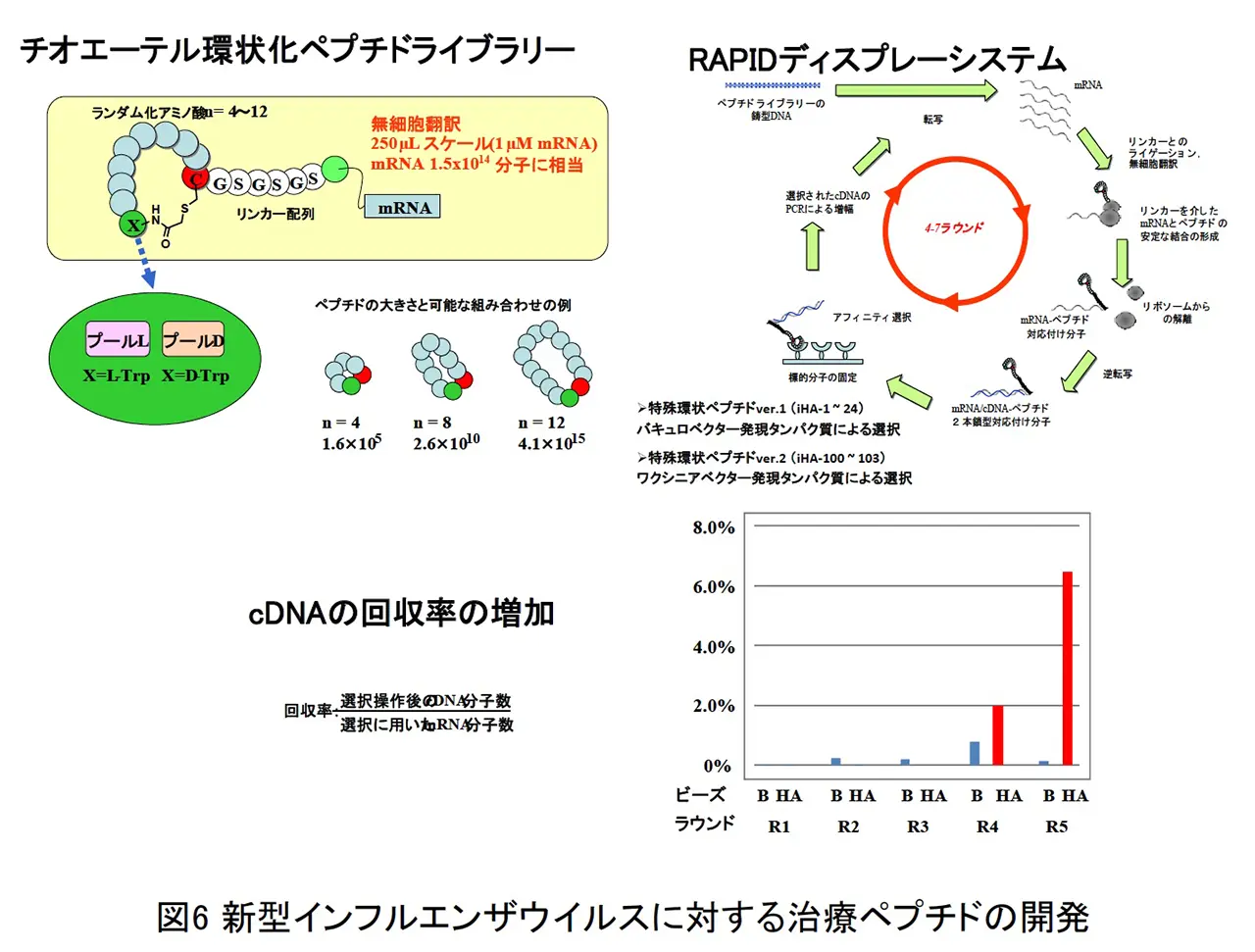 近年、第3世代の抗体医薬として特殊環状ペプチドが注目されています。特殊環状ペプチドは分子量が 500-2500 と小さく、立体構造上の障壁が大きい HA 蛋白質のストーク領域にも結合できる可能性があり、交差反応性が高くなることが期待できます。現行のインフルエンザ治療薬の多くは、ウイルス因子のノイラミニダーゼに対する阻害剤です。感染細胞からインフルエンザウイルスが出芽するのを阻害するという作用特性上、ウイルスが増殖した感染中期以降での阻害効果が顕著に減弱する事や遺伝子変異した薬剤耐性ウイルスが出現する事が問題点として挙げらます。私たちはこれまでにインフルエンザウイルスのヘマグルチニン蛋白質を標的とした特殊環状ペプチドの探索を行い、治療に用いられているリレンザと同等以上の阻害活性を有するペプチドを見出しました(図6)。この特殊環状ペプチドは H5N1/H1N1/H2N2 の 3 つの亜型に対して防御効果を発揮しました。さらに、この特殊環状ペプチドはリレンザ耐性のH1N1パンデミック 2009 に対しても強力な阻害活性を示しました。見出した特殊環状ペプチド iHA-100 がインフルエンザウイルス増殖を抑制するメカニズムを解明する目的で、ウイルス感染環のどこの段階を阻害しているかについて詳細な解析をおこないました。異なるタイミングで iHA-100 を培養上清に添加する実験をおこなったところ、iHA-100 の作用機序として、細胞外に存在するウイルス粒子の感染性を中和するだけでなく、細胞内においても HA と相互作用し侵入過程の複数の段階を阻害するといった新たな阻害機序が明らかとなりました(図 7)。更に、動物モデルを用いた治療実験において、感染初期にしか効果の無いリレンザとは異なり感染後期においても劇症肺炎抑制による治療効果があることがマウス及びカニクイザルの実験で確認されました(図8)。