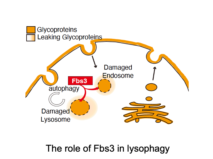 Fbs3という糖鎖認識ユビキチンリガーゼはミリストイル化という脂質修飾を受け細胞内のオルガネラ膜に結合する特徴を持っています。そのため、細菌感染や細胞外から取り込まれた微粒子によりリソソーム膜損傷を受けると、そこから露出するオルガネラ内のLAMP2という糖蛋白質糖鎖を目印に素早く集積しオルガネラ全体をユビキチン化することでオートファジーを誘導し、損傷リソソームを除去することを見出しました。この現象はリソファジーと呼ばれています。