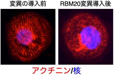 図4.RBM20の変異を導入したiPS細胞由来の心臓の筋肉の細胞 筋肉の収縮のために必要な縞状のサルコメアという構造をアクチニン(赤色)というたんぱく質と細胞の核(青色)を可視化することで観察した。変異を導入した細胞ではサルコメアが正しく形成されなかった。