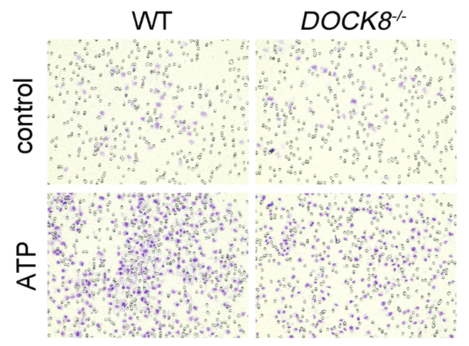 ATP依存性に小さな孔のあいた膜を透過したミクログリア(紫色)の細胞数を調べた。DOCK8欠損ミクログリア(右下)では野生型ミクログリア(左下)と比較して、遊走性が大きく低下していた。