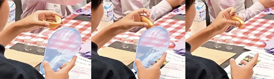 ライム・オレンジ・シナモン・バニラ精油でコーラ風の香りを作る実験や、オレンジの皮の香り成分である「リモネン」が風船を割る化学的性質に驚きの声があがりました。