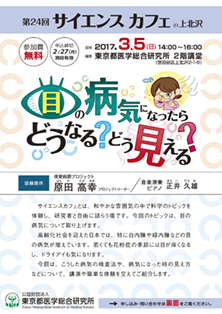 サイエンスカフェとは、和やかな雰囲気の中で科学のトピックを体験し、研究者と自由に語らう場です。今回のトピックは、目の病気について取り上げます。高齢化社会を迎えた日本では、特に白内障や緑内障などの目の病気が増えています。若くても花粉症の季節には目が痒くなるし、ドライアイも気になります。