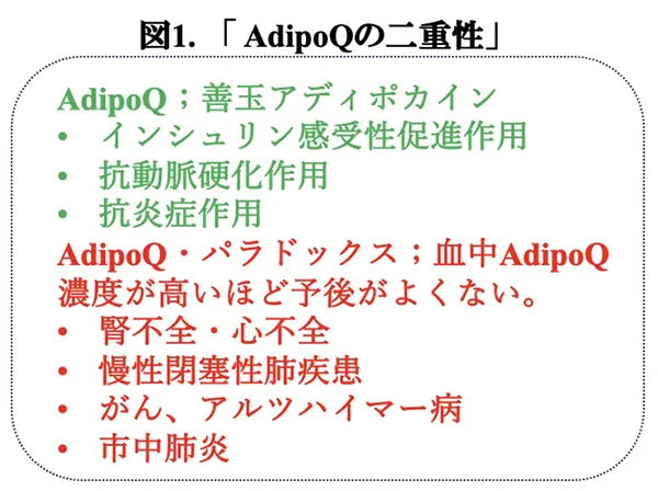 AdipoQは、脂肪細胞から分泌される分子量約30kDのアディポサイトカインで、血中濃度は一般的なホルモンに比べて桁違いに高く、μg/mlオーダーに達します。AdipoQはインシュリン感受性促進作用(インスリン抵抗性改善作用、抗動脈硬化作用)、抗炎症作用を有し、 さらに、肥満、糖尿病、高血圧、メタボリックシンドロームなどの生活習慣病で、しばしば血中の濃度が低下することから、AdipoQ産生を高めることは生活習慣病や循環器疾患の予防・治療に有益であると考えられました。しかしながら、これとは対照的に腎不全や心不全で血中AdipoQ濃度が高いほど予後がよくないという、所謂、AdipoQ・パラドックスが報告されました。引き続き、慢性閉塞性肺疾患*4、がん、アルツハイマー病などのさまざまな疾患においてもAdipoQ・パラドックスが観察され、AdipoQ・パラドックスは老年期の慢性疾患における共通の病態メカニズムではないかと考えられました(図1)。このような状況で、デンマーク・コペンハーゲン大学病院 のArnold Matovu Dungu博士らは、前向きコホート研究の結果、市中肺炎の重症化(死亡、または、再入院)においても、AdipoQ・パラドックスが関与していることを見出しました。この結果は、Front. Med. 誌に掲載されましたので(文献1)、今回は、この論文を報告いたします。現時点において、老年期の慢性疾患に対する治療法は確立されてはいませんが、AdipoQ・パラドックスはこれらの疾患に共通する治療標的になる可能性があります。