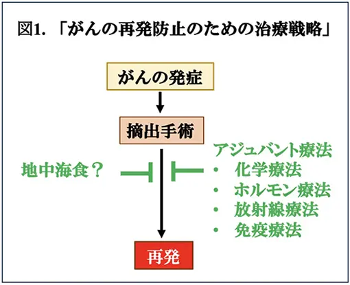がんは根治手術で完全に取り除いたと思っても、多くの場合、再発します。現時点で再発のメカニズムは不明ですが、目に確認できない小さな腫瘍が手術の時に取り残されるか、あるいは、すでに転移している可能性があります。このようにして生き残った腫瘍が治療に対する抵抗性を獲得して、時間と共に徐々に復活してくると考えられます。そこで、手術する前後に再発を防ぐ目的で化学療法やホルモン療法、放射線療法、さらに、最近では、免疫療法などが手術の補助(アジュバント)療法として行われています(ステージIB胃がんに対する術後化学療法の有効性〈2024/6/13掲載〉)。実際、アジュバント療法の進歩により、再発率は有意に下がりましたが、それでも十分ではなく、更なる改良が必要です。このような状況で、最近、食事療法が見直されています(図1)。食事療法と言うと少し原始的に思われますが、もし、効果的ならば、副作用などの侵襲性がない、高額な医療費がかからないなど非常に魅力的です。今回、イタリア・ミラノにありますIstituto Nazionale dei TumoriのFranco Berrino博士らは、マクロビオティック*1の伝統に基づいた地中海食が乳がんの再発を防ぐ効果があるかどうか調べるための臨床試験;DIANA-5ランダム化試験*3を行い、食事療法を遵守することにより、再発から保護される可能性があることを見出しました。この結果は、Clin Cancer Res. 誌に掲載されましたので報告いたします(文献1)。ご存じの方も多くいらっしゃると思いますが、神経変性疾患の研究分野におきましてもアルツハイマー病などの認知症に対する地中海食の有益な効果はトッピクスの一つになっており、がんと認知症に共通する治療法の一つになる可能性があり注目されます。