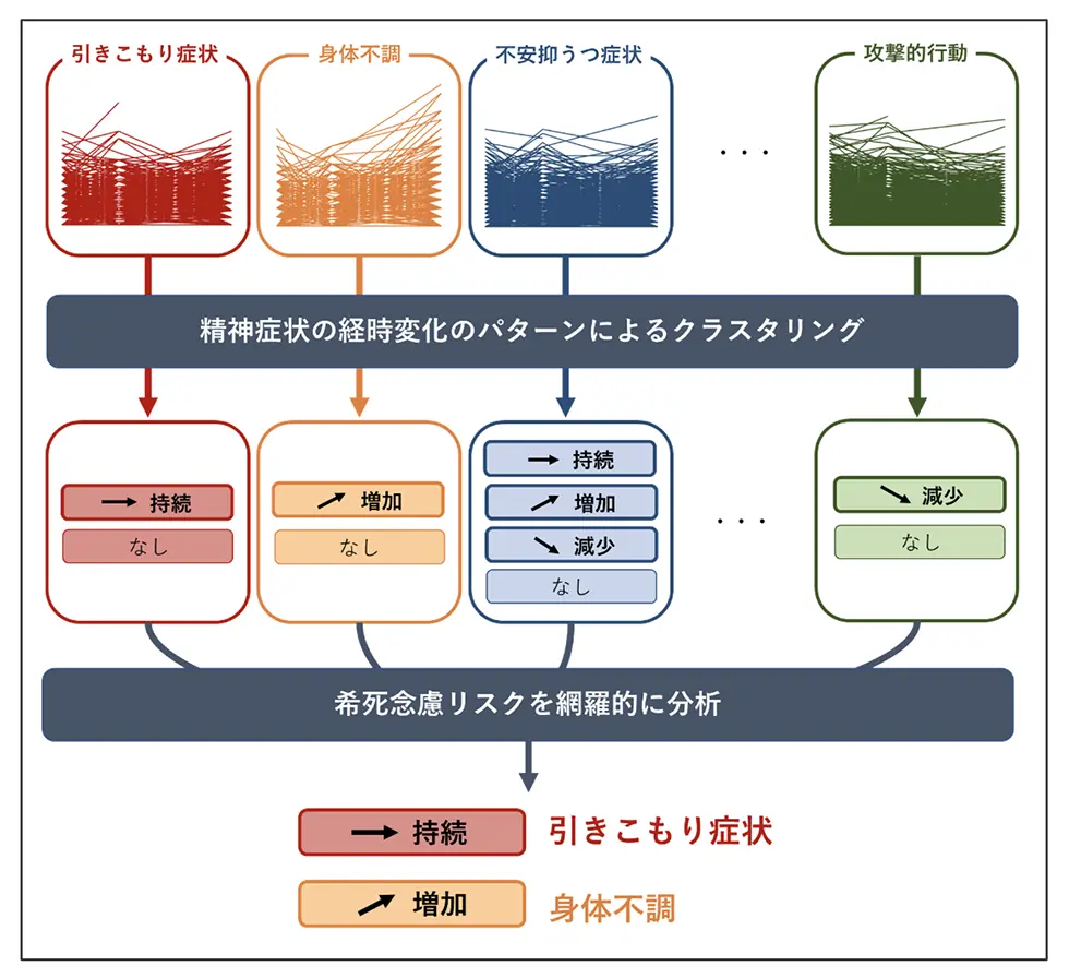 そこで本研究では思春期のさまざまな精神症状を網羅的に扱い、各症状の経時変化のパターンによってクラスタリング(注1)したうえで希死念慮(注2)との関係を調べました。